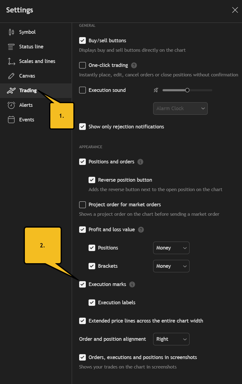 1. There is a setting within TradingView required to display executions on your charts. To automatically plot execution labels on your chart within TradingView, please right click your TradingView charts > Settings > Trading > Enable Execution Marks a & execution labels: