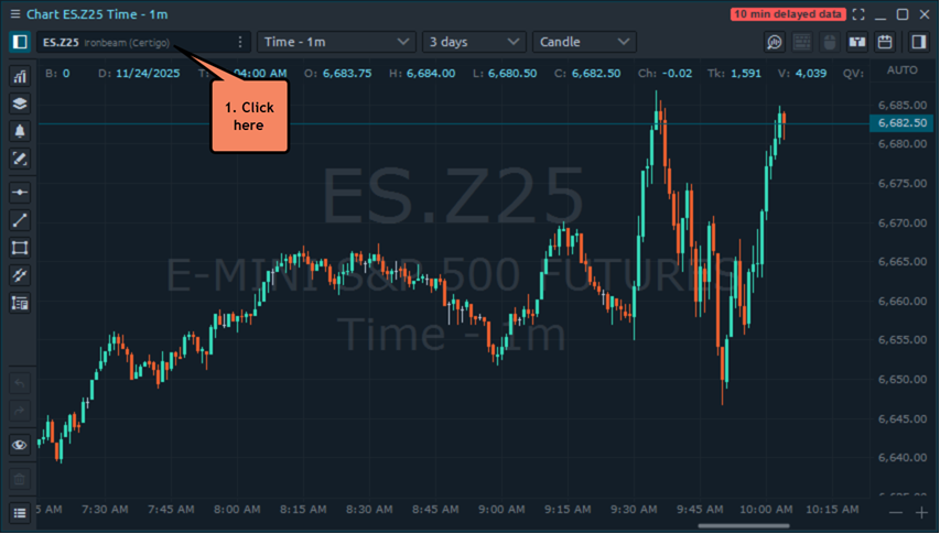 Once you connect to your live account in the initial menu that opens, in the top left of your chart, you need to click the dark bar to change your symbol (1):